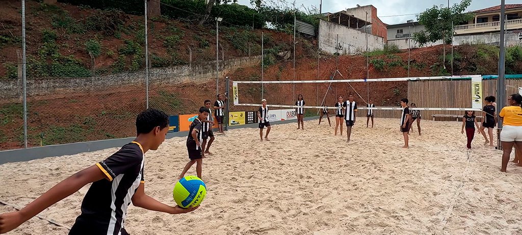 Alunos do projeto Escola do Futuro participaram de atividades como jogos de areia, vôlei de praia, beach tennis e futevôlei. A programação buscou afastar o tédio das férias escolares e estimular integração, lazer e movimento.