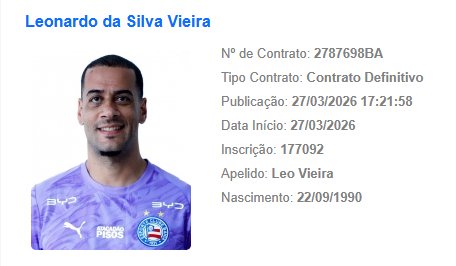 Salvador, 27 de março de 2026 – O Bahia ganhou mais uma opção para o gol. O registro de Léo Vieira foi oficializado no Boletim Informativo Diário (BID) da CBF nesta sexta-feira (27), concluindo a regularização do atleta antes do encerramento da janela de transferências extra.